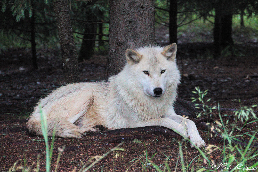 Oui il y a des enclos. Non ce n’est pas un zoo. Nous sommes là pour observer, pour apprendre ou plutôt réapprendre et comprendre ce bel animal trop longtemps diabolisé. Nous ne sommes pas là pour lancer des cacahuètes à des animaux captifs obligés de faire des pirouettes. Il y a trois enclos où les loups vivent en semi-liberté. Des loups arctiques, des loups gris et des loups arctiques imprégnés. C’est ces derniers que vous verrez le plus souvent car ils ont justement été imprégnés, c’est à dire habitués au contact de l’homme durant le premier mois de leur existence (enfin, ici, de Gilles). Ils ne sont pas dressés ni apprivoisés. A leurs yeux, nous sommes des éléments de la meute. Concernant les autres loups, vivant également en semi-liberté, et qui n’ont pas été imprégnés, il vous faudra vous armez de patience, de discrétion et vous levez tôt ou venir tard pour peut-être les apercevoir. Leur terrain au sein du centre d’observation de la forêt boréale étant largement assez vaste pour qu’ils échappent à notre vue.
