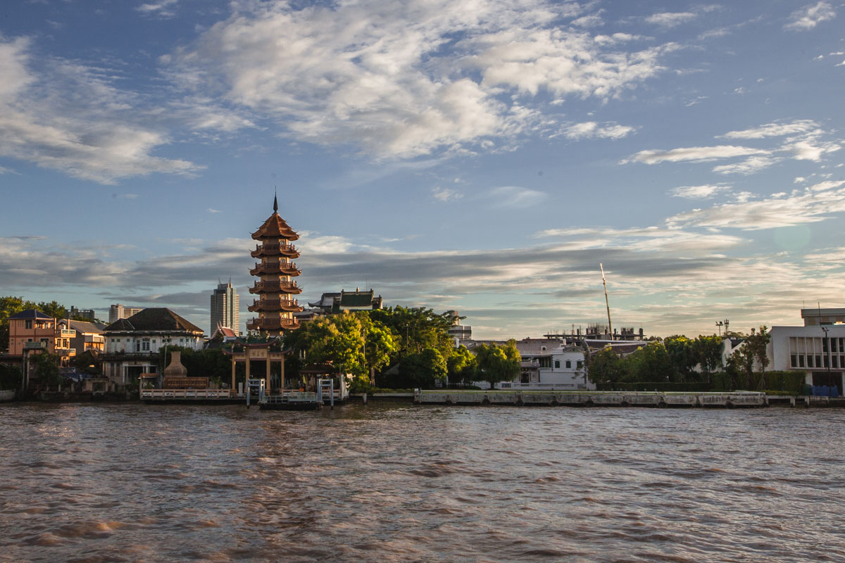 Sur le pont du bateau, on admire et capture, l’appareil photo à la main; défile devant nous les nombreux temples et palais aux noms exotiques : le temple de Wat Arun, celui de Wat Prayoon, le Palais royale, ici l’ambassade de France, là des badauds accoudés au balcon ou à la terrasse de cafés, badauds flânant insouciants aux dernières lueurs. On est loin du Bangkok à backpackers que certains promeuvent à tout va comme l’expérience unique et cheap à déguster en s’enivrant de bières bons marchés.