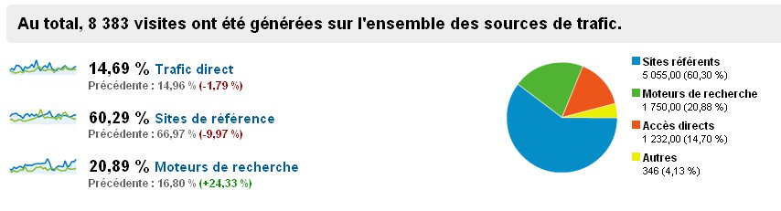Concernant ma réputation de commentateur fou, je ne suis pas tant de blogs que ça… honnêtement, allez, à la louche, moins de 100 ^^ En tout cas, sachez que je ne le fais pas pour le trafic mais par plaisir car le cumul en provenance des autres blogs atteint environ 6% sauf qu’on ne peut pas deviner le trafic indirect lié…