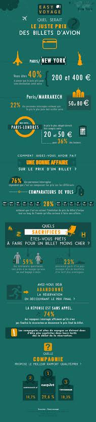 #INFOGRAPHIE Le site easyvoyage propose une infographie intéressante concernant le juste prix des billets d’avion. Personnellement, le “juste” prix, selon ma définition personnelle, est le prix le moins cher que je trouve à une période donnée. Et parfois en effet, c’est un peu souvent la roulette russe entre le prix affiché sur un comparateur de vol, un prix d’appel qui est fort alléchant, et le prix réel demandé à la fin ou, comme par magie, de nombreuses taxes sont venues se rajouter modifiant, évidemment à la hausse, le prix de ce dernier, avec un prix final qui peut être supérieur de 50 à 100 euros. Cela fait mal au port monnaie et au moral. Particulièrement si on compte chaque euros de notre budget transport ! Rendant, du coup, l’opération beaucoup moins attractive… mais, avec l’effet d’entrainement, et les compagnies en sont très bien concientes, comme on a déjà passé énormément de temps à chercher, comparer, vérifier, à ce stade, on est parfois fatigué et on paye la surcote en se disant que ces surcoûts seront les mêmes partout ou qu’il n’y a peut-être plus aucun billet de disponible.