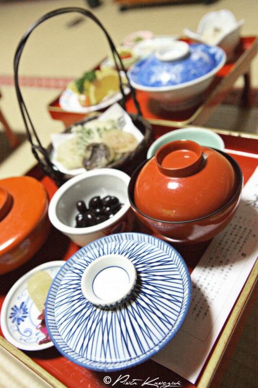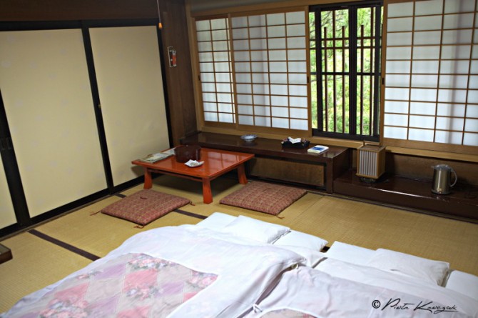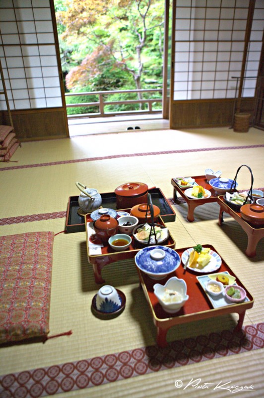 On se relaxe à la vue du jardin et des estampes près des murs… les plats harmonieusement disposés sont végétariens. Ils cultivent leur propre légume. Nous mangeons lentement, savourant tant avec les yeux qu’avec notre palais chaque bouchée de cette cuisine cuisine shôjin (精進料理) de laquelle viande et poisson sont omis. La nuit s’invite telle une amie de passage et nous voilà déjà enveloppés dans nos draps dans cette chambre spartiate, mais confortable, aux murs de papier.