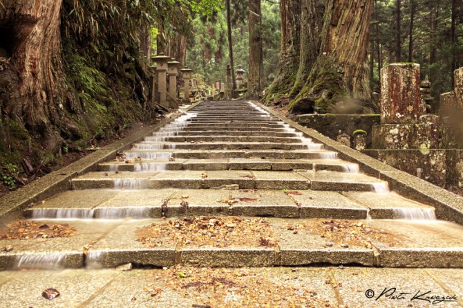 Cette ville perchée sur le mont Koya (Koyasan) à 800m d’altitude où, selon la légende, un moine bienveillant, Kôbô Daishi (弘法大師), plus connu sous le nom de Kûkai (空海) fonda la secte bouddhiste Shingon (真言宗), au retour d’un voyage initiatique en Chine, il y a 1200 ans de cela.