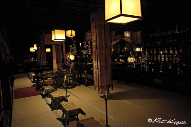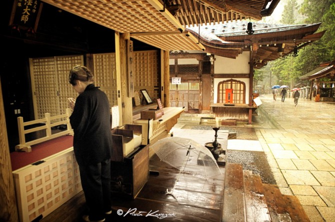 Je flâne et observe sans voir, aveuglé par la pluie, traversant sans m’en rendre compte le pont Gobyôbashi (御廟橋), frontière invisible qui nous faire pénétrer dans la zone sacrée où se trouve le mausolée de Kûkai. La salle des lanternes, le Tôrô-dô (灯篭堂), est transpercée de milliers de lanternes offertes par les pèlerins dont la flamme et la foi se doivent d’être éternels, sans cesse ravivés. On ne boit pas, on ne manque pas, on ne prend pas de photos.
