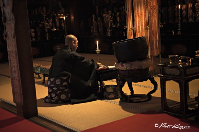 Instant de prière à 6h après un éveil vers 5h. J’ai presque envie de me joindre avec eux dans ce champ guttural. Je me sens calme, apaisé… si ce n’est le prix qui n’est pas à la portée de toutes les bourses et particulièrement des nôtres, je pourrai rester longtemps à méditer en ce lieu, Magda à mes côtés. Loin du monde, loin des turbulences, loin de ce temps qui nous échappe en futilités. Si j’étais venu célibataire, je ne serai peut-être jamais reparti. Prisonnier volontaire d’un monde chaste, cloisonné, agencé par les obligations et les prières, visant le zokushin jôibutsu, l’état de plénitude de Bouddha. J’ai toujours été attiré par cette sorte de réclusion sur soi-même. Cette solitude voulue et assumée. Héritage personnelle d’une vie durant laquelle mes parents travaillaient de nuit.