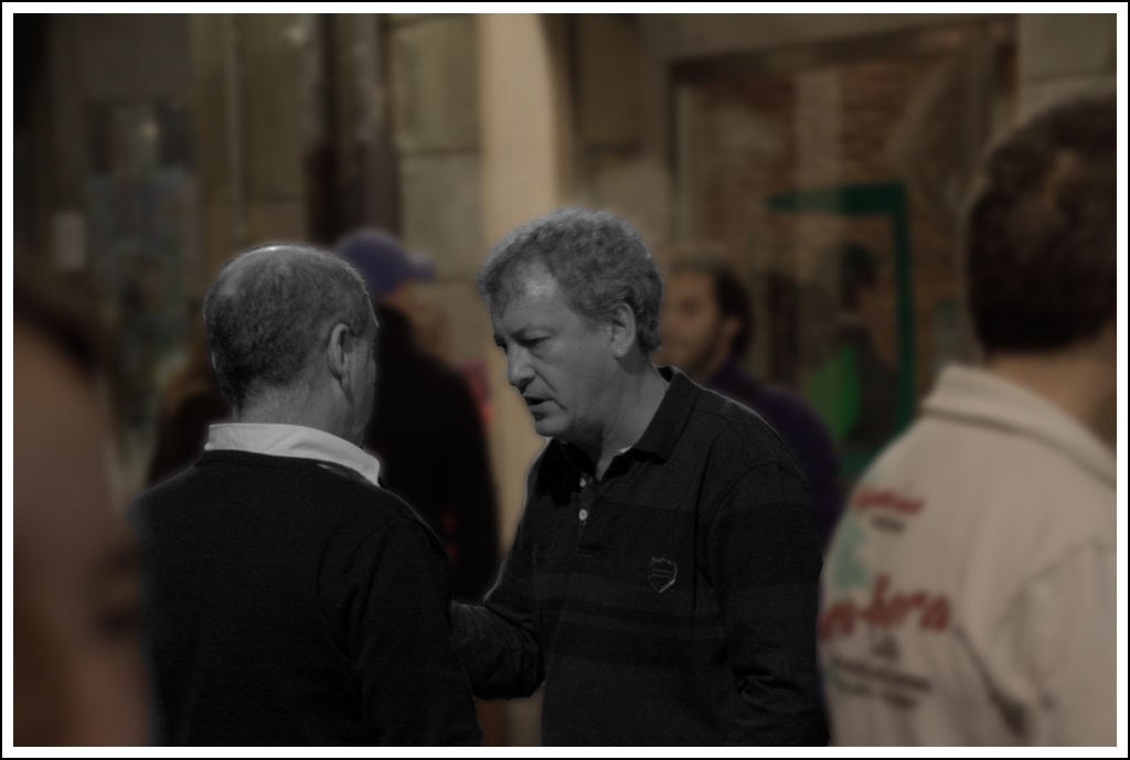 La nuit n’est pas non plus que pour nous. D’autres discutent, de vieux amis se rencontrent et se retrouvent. Je voulais absolument faire une photo de ces deux-là. Ils me semblaient un peu hors du temps. Mes collègues devaient me prendre pour un extrémiste à vouloir les photographier.