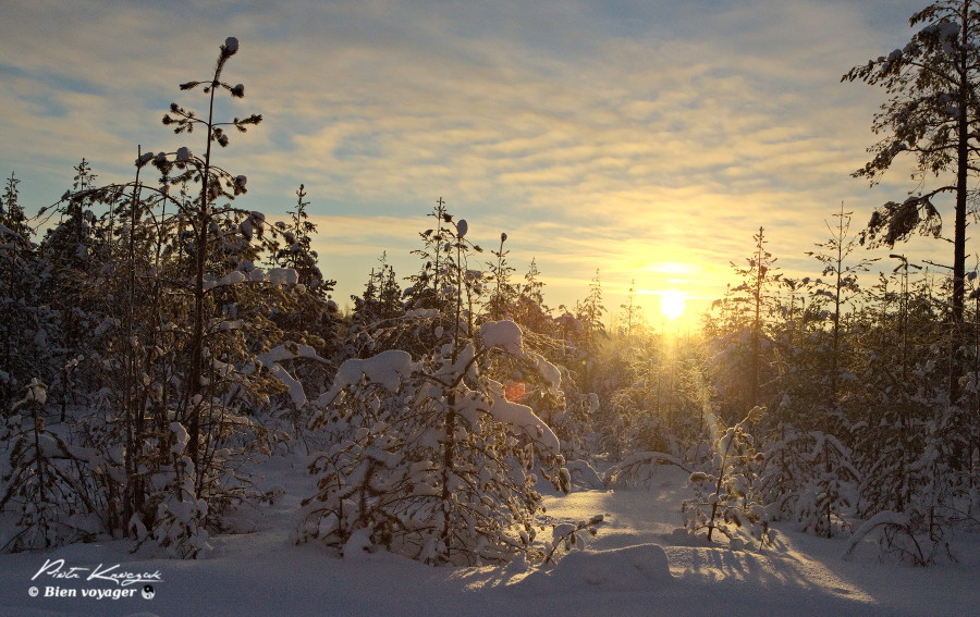 Je suis constamment en train de me dire qu’il faut nous presser car le soleil est bas. Sauf qu’à cette latitude et à cette période, le soleil est bas durant 6 heures en mode coucher/lever de soleil permanent. Vous profitez d’une lumière chaude et rasante de lever de soleil toute la journée. Splendide. On ne s’en lasse pas. Elle caresse les sommets des pins,la lumière se faufile entre leurs troncs, elle avale ce tapis blanc et permet de prendre de beaux clichés.