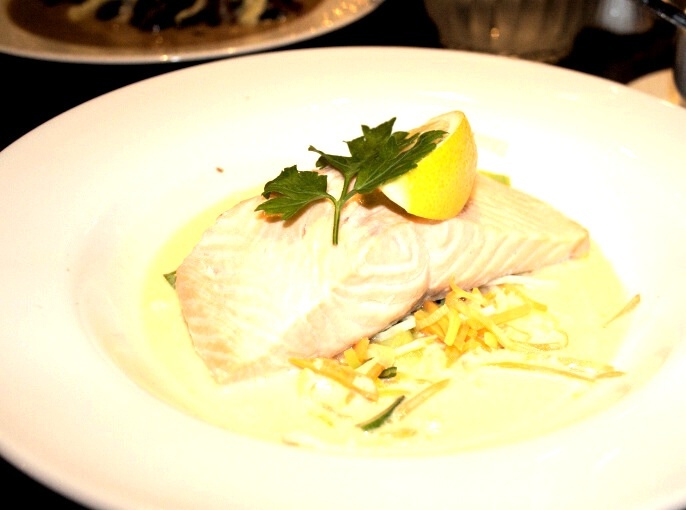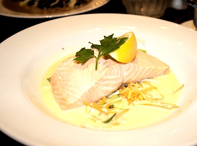Le saumon fumé avec sauce au vin blanc: « steamed salmon in white wine sauce”est aussi un très bon choix.