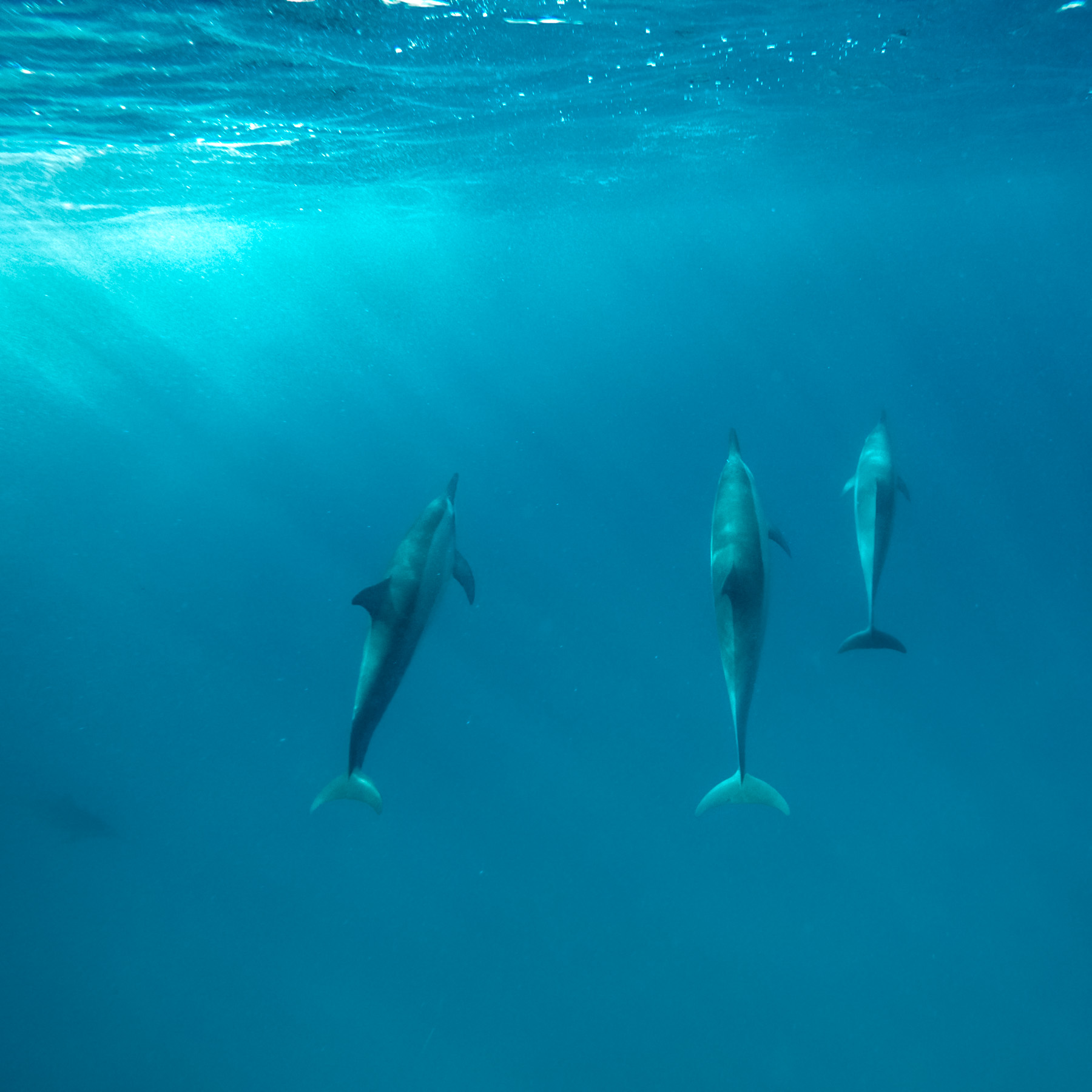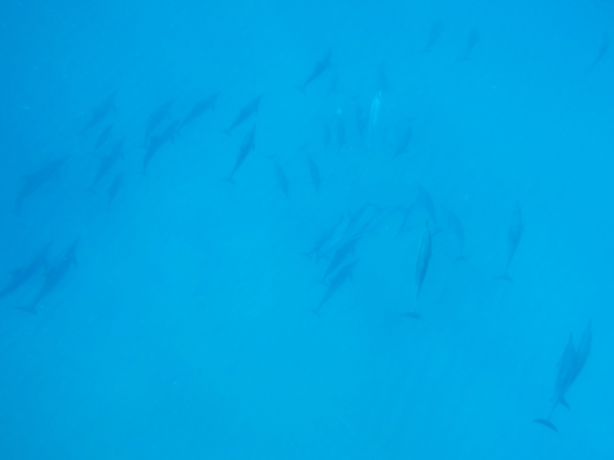 D’une dizaine de bateaux (ce qui est déjà beaucoup par rapport à mon expérience en Nouvelle-Zélande où on était seulement 3 bateaux)… on est passé à plus d’une trentaine. Tous, se bousculant les uns les autres dans une orgie de bruits et d’odeurs d’essence qui flottait en fine pellicule sur l’eau et qui vous montait à la tête lorsque vous nagiez, à vous écœurer. On poursuivait le banc de dauphins et on slalomait entre la masse de nageurs en évitant de se perdre et de se prendre un coup de palme voir un coup de bateau. Certes, il y a eu, je ne vous le cache pas, cet instant où tu vois les dauphins passer à quelques mètres, sous toi, dans une grâce indescriptible… mais à ce prix ?