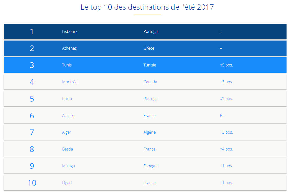 Et bien figure toi que je m’attendais moi-même à connaitre ne serait-ce que de nom, le top 10 des destinations estivales 2017 et bien même pas ! Figari, en Corse, c’est la première fois que j’en entends parler. Malaga je connais de nom. Alger, Tunis et Athènes (pas encore mais pour bientôt peut-être…), toutes en bonne position, je n’ai pas eu la chance de les découvrir (pour le moment, on ne peut pas être partout à la fois).