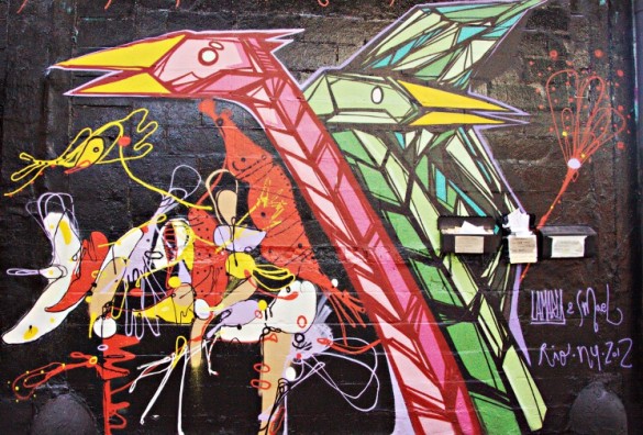 Des artistes du monde entier ont laissé leur empreinte à 5 Pointz. Japon, Canada, Brésil, Suisse (ils sont venus entre deux randonnées dans les Alpes ? 🙂 et forcément les Etats-Unis, représentés Stay High 149, Tracy 168, Cope2, Part, and Tats Cru , tous sont venus poser leur griffe,