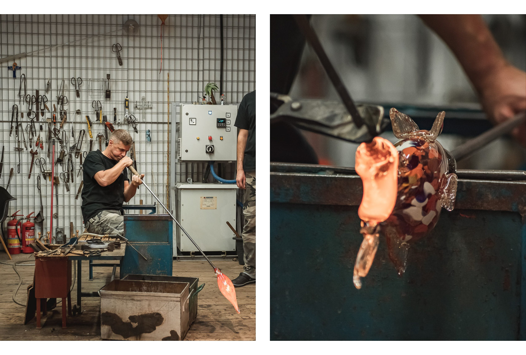 Dans l’atelier, deux verriers travaillent comme deux musiciens : l’un souffle et façonne, l’autre ajoute les gestes qui fixent la forme. La masse liquide devient poisson, coupe, éclat ; une matière née de la flamme puis confiée au froid.